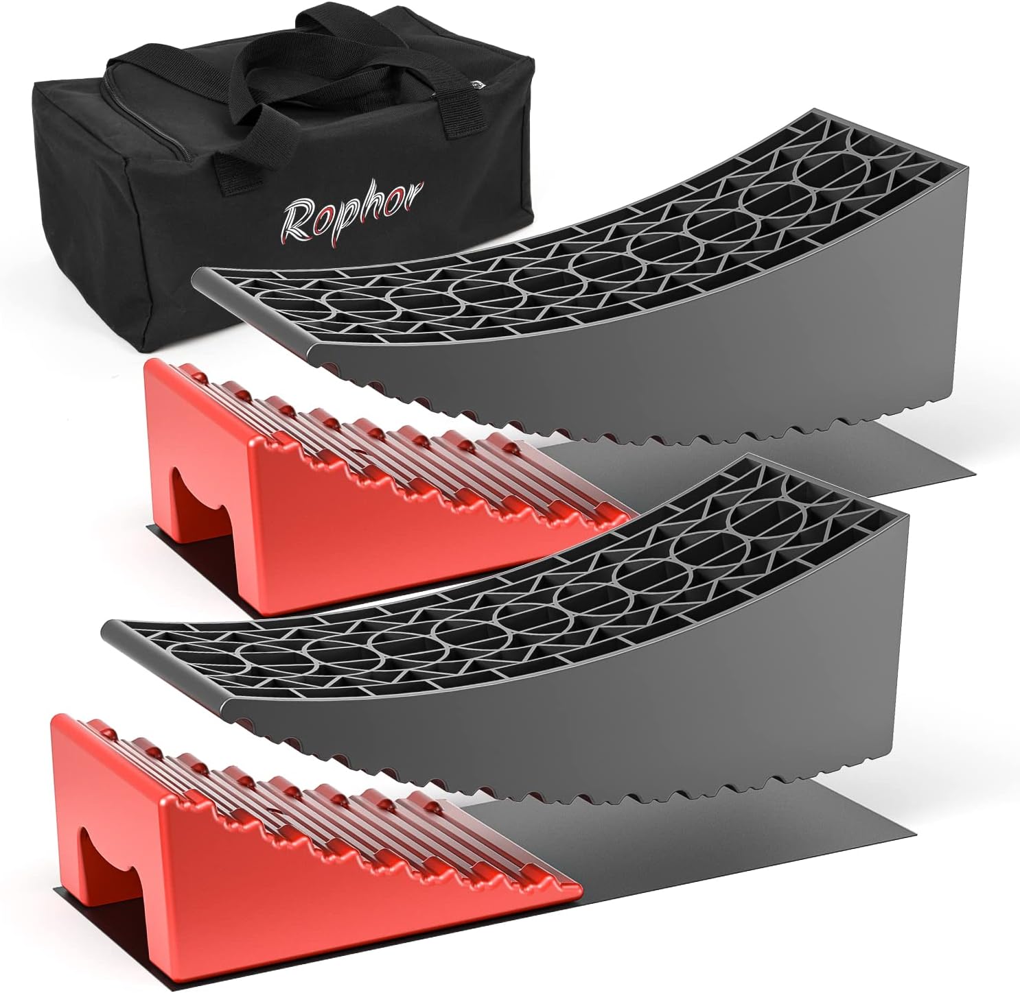 The Rophor Camper Leveler 2 Packs is a top-of-the-line leveling solution for your travel trailer. With its double non-slip design, heavy-duty construction, and easy-to-use features, it offers a precise leveling experience in less than 5 minutes. Designed specifically for dual axle trailers, it eliminates the need for modifications and provides a secure and durable leveling solution.